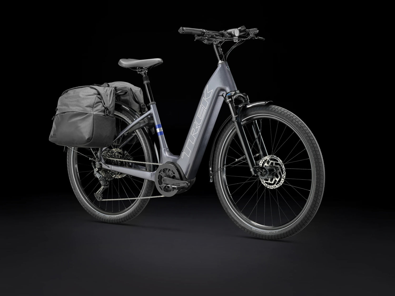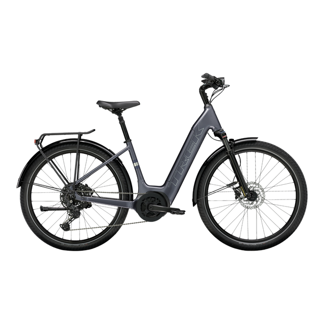 A lightweight Alpha Smooth Aluminium frame with a low-step geometry, a Bosch Performance Line Sport (250 W, 75 Nm) drive unit capable of sustaining speeds up to 45 km/h, a long-range 545 Wh battery that's fully encased in the frame and a Bosch Purion controller. A suspension fork and seat post for soaking up bumps. Plus, a 10-speed Shimano CUES drivetrain, hydraulic disc brakes for all-weather stopping power, wide puncture-resistant tyres for extra stability, ergonomic grips, a kickstand, lights, an MIK rack and mudguards.